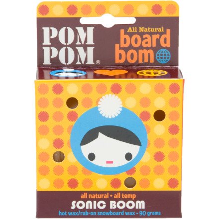 Blast across the flats and past your pals with the help of the Pom-Pom Sonic Boom Board Wax. This earth-friendly, all-temperature wax is made from all natural components, and you can either rub this baby on in the parking lot or iron over your board the night before.Product Features