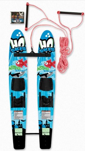 Teaching kids to water ski has never been easier thanks to the Hot Shot Trainers. The set comes equipped with a stabilizer bar, tow rope and fun How To DVD to get the entire family excited. The stabilizing bar keeps the skis together at the correct distance and the Tow Rope places your skier in the proper ski position. The Tow Rope has a handle at each end allowing you to control your child's ride from start to finish ensuring they will be stoked to do it again. The skis are also designed to get on plain easily and they ride high in the water at slow and comfortable speeds. Pop in the DVD on the way to the lake and watch your Hot Shot feel the confidence our Trainers provide.